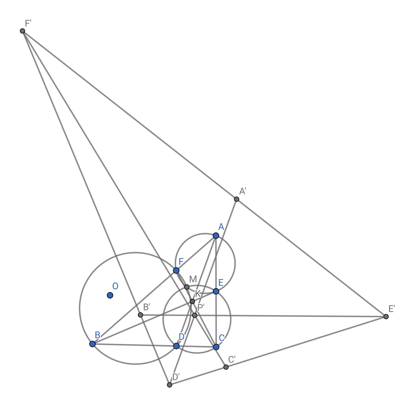 证明:把整个图以点$M$为反演中心,$1$为反演半径作反演,每个点的反演像用这个点的名称后面加上一个$’$来表示。则: